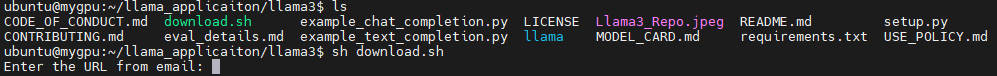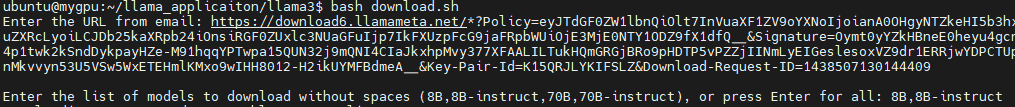 받고 싶은 모델의 이름을 띄어쓰기 없이 ,로 구분하여 입력하면 된다. 나는 8B, 8B-instruct를 다운받았다. 8B 모델은 용량이 약 15G 정도 되는 것 같다. 모델당 다운로드에 20분 정도가 소요됐다.