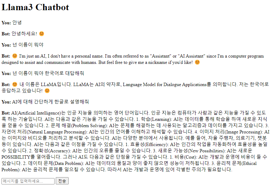 줄바꿈이 프론트에서 적용이 되지 않아 형식이 이상하지만 한국어에 대해서도 자연스럽게 결과가 나오는 것을 볼 수 있었다.